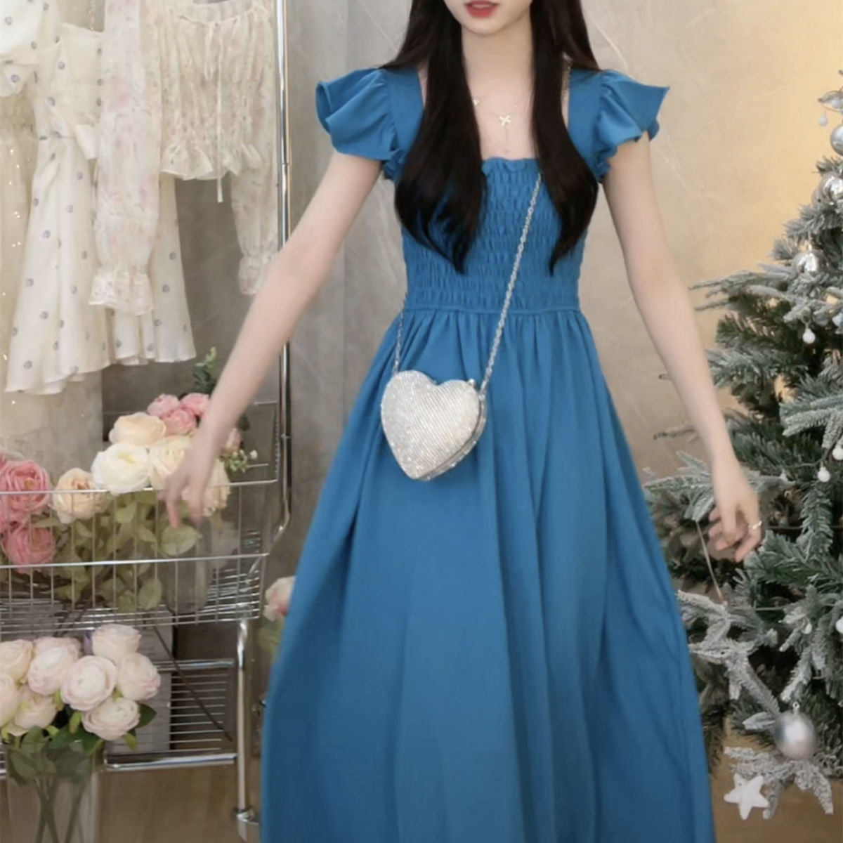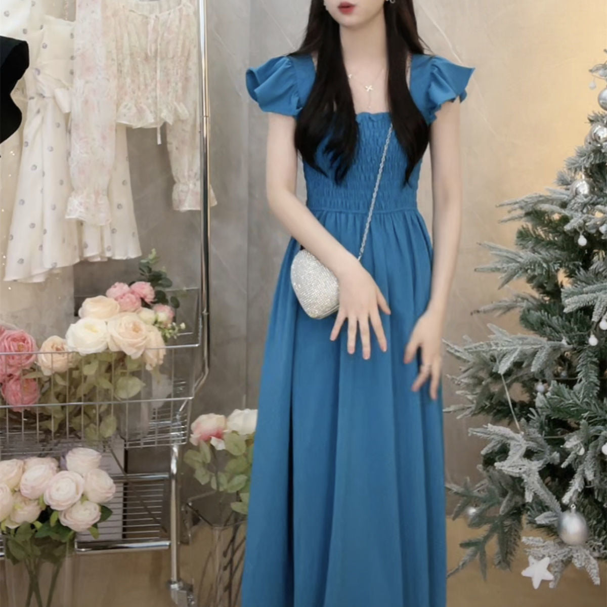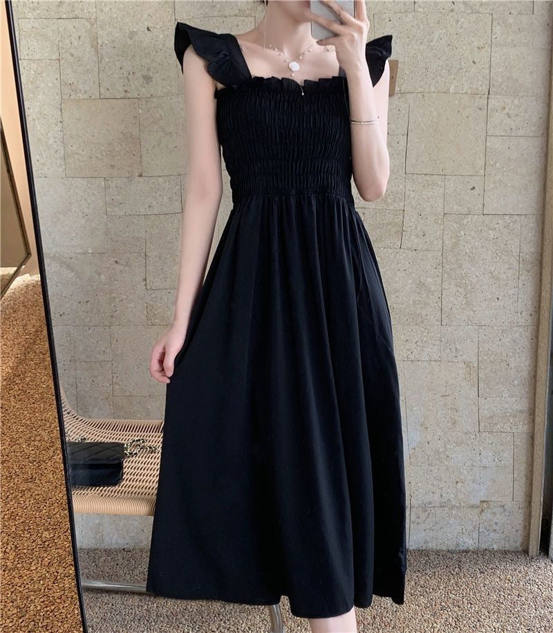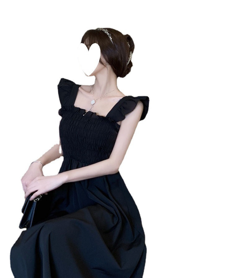 2023 Summer New French Style Elegant Small Flying Sleeve Pleated Waist Slimming Dress Hepburn Style Square Collar Tea Break Medium